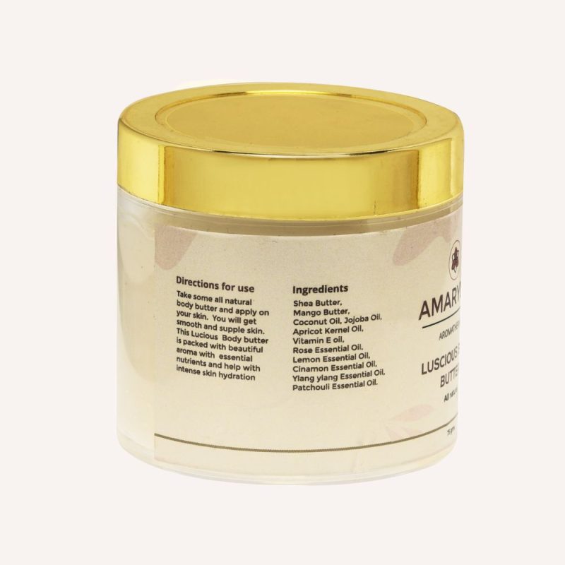 Lucious Body Butter delivers a spa-like experience with its blend of rose and lemon essential oils. This ultra-rich formula deeply hydrates, leaving your skin glowing and incredibly soft. Ideal for a touch of daily luxury or a pampering treat.